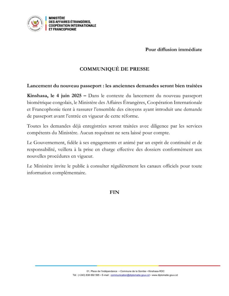 Alors que le lancement du nouveau passeport biométrique congolais suscite des inquiétudes au sein de la population, le ministère des Affaires Étrangères, Coopération Internationale et Francophonie tient à rassurer les citoyens : toutes les demandes déjà introduites seront bel et bien traitées.